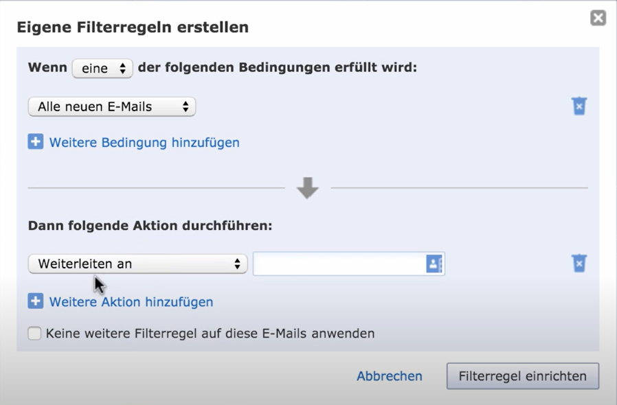 • Wähle als Bedingung „Alle neuen E-Mails“ und als Aktion „Weiterleiten an“.