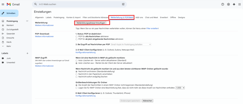 • Öffne erneut den Tab „Weiterleitung & POP/IMAP“.