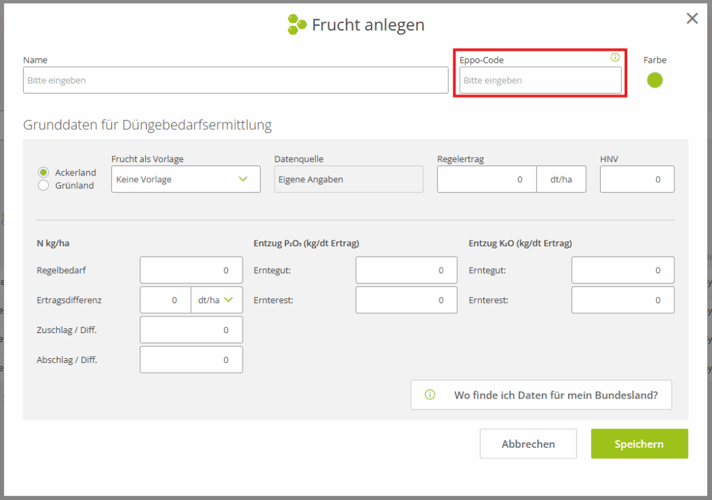 In der Ackerschlagkartei von top farmplan steht Dir eine Datenbank mit gängigen Früchten zur Verfügung. In dieser Datenbank ist der EPPO-Code bereits hinterlegt.