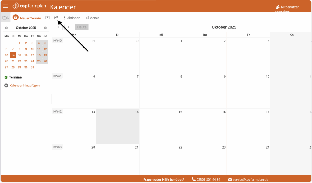 In topfarmplan kannst Du Deinen Kalender ganz einfach im Modul „Kalender“ exportieren.Klicke dazu auf den Export-Button und speichere die Datei auf Deinem Rechner.