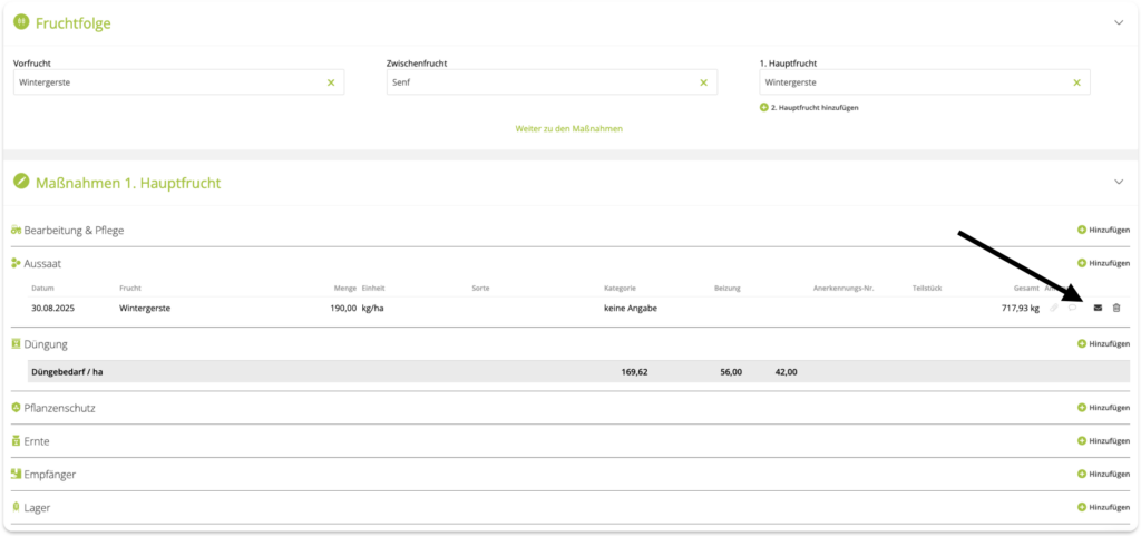 In top farmplan kannst Du eine Maßnahme ganz einfach per E-Mail an Deine Mitarbeiter verschicken. Wähle dazu zunächst den Schlag aus, auf dem die Maßnahme dokumentiert ist. Scrolle anschließend nach unten zum Bereich „Maßnahmen“ und klicke die gewünschte Maßnahme an. Auf der rechten Seite findest Du das E-Mail-Symbol. Mit einem Klick darauf kannst Du die Maßnahme direkt versenden.