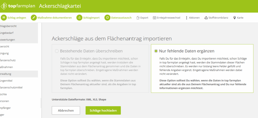 b) Wenn Deine Daten in top farmplan aktueller sind als aus dem Flächenantrag woraus Du die Daten importieren willst, wählst Du „Nur fehlende Daten ergänzen“ aus. Dies ist z.B. sinnvoll, wenn Du eine Flächenteilung vorgenommen hast oder die Geometriedaten nachträglich hochladen möchtest.
