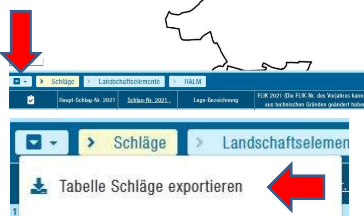 5. Klicke nun unten links auf den Pfeil und klicke „Tabelle Schläge exportieren“ an. Diese heruntergeladene Datei bitte abspeichern. Die Datei die dort heruntergeladen wird ist eine XLS-Datei.